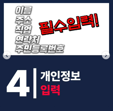 이후 필수입력으로 이름, 주소, 직업, 연락처, 주민등록번호 기본적으로 가입시에 필요한 정보를 입력해주시면 됩니다.