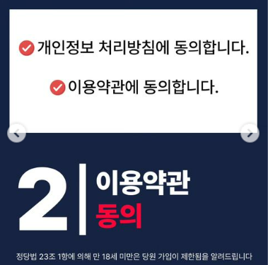 이준석 인스타에 공개된 개혁신당 가입방법으로 총 다섯가지 스텝을 보여주었습니다. 그 중 첫번째가 www.개혁신당.kr 홈페이지 주소를 입력하여 들어가고 바로 보이는 개인정보 및 이용약관에 동의해주시면 됩니다.
