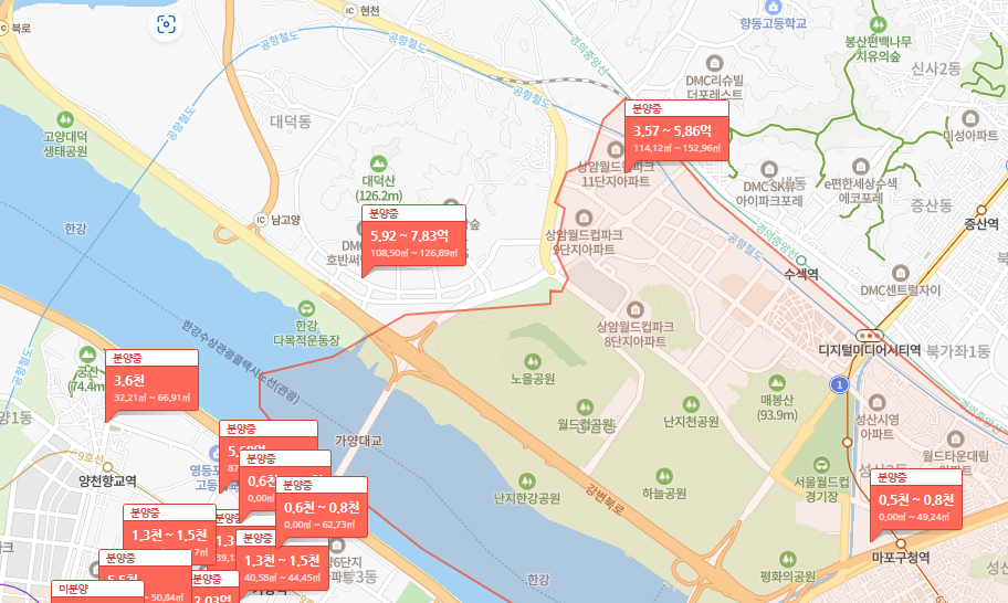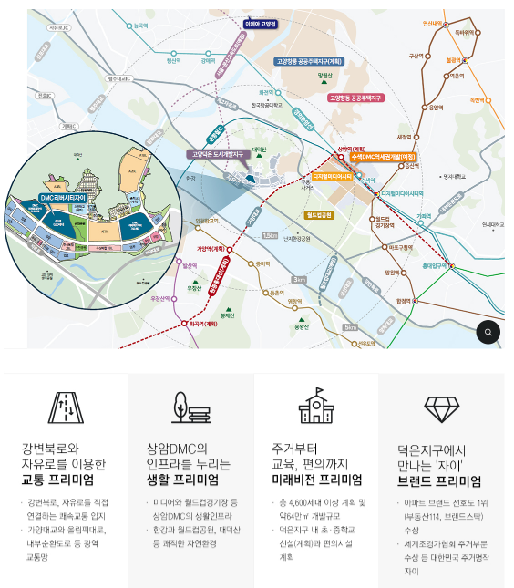 DMC한강자이더헤리티지는 경기도 고양시 덕양구 덕은동에 위치해있는데, 익숙치 않은 동네일 수 있습니다. 하지만 지도를 보시면 서울권이라해도 무리 없는 한강 서북권에 위치한 지역으로 볼 수 있습니다. 월드컵공원과 서울 경계지역에 위치한 고양시 덕양구로 현재 개발지역으로 알려졌습니다.
