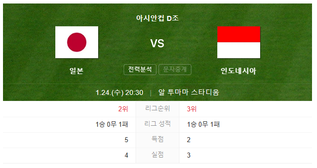 현재 일본은 D조 2위로 1승 1패의 전적을 가지고 있으며, 득점 5점에 실점은 4점을 기록하고 있습니다. 인도네시아는 D조 3위로 일본과 같이 1승 1패이나 득점면에서 3점이나 떨어진 상황입니다.
