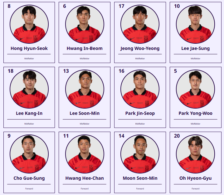 - 미드필더 : 손흥민, 이강인, 박용우, 이재성, 홍현석, 황인범, 정우영, 황희찬, 이순민, 문선민, 박진섭, 양현준