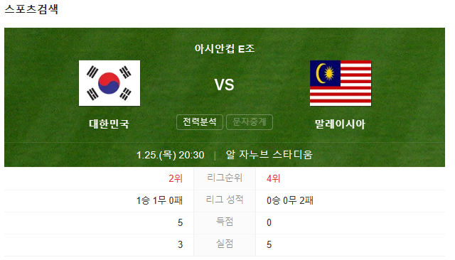 현재 카타르 아시안컵 대한민국 전적으로는 2경기 4승점 1승 1무 0패이며, 조 1위에 머무르는 요르단은 2경기 4승점 1승 1무 0패, 조3위 바레인은 2경기 3승점 1승 0무 1패, 그리고 4위 말레이시아는 2경기 0승점 0승 0무 2패의 전적을 기록하고 있습니다.
