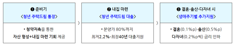 젊은 층들의 내 집 마련을 위해 생애 주기에 걸쳐 정책을 내놓았습니다. '청년 내 집 마련 1,2,3 주거지원 프로그램'은 1번 준비기 청년주택드림통장 청약통장을 통한 저축으로 자산 형성 및 내 집 마련 기회가 제공이 되며, 2번 내 집 마련에서는 청년 주택드림 대출을 통해 분양가 80%까지 최저 2.2%에서 최장 40년까지 대출 지원을 받을 수 있게 하였습니다.