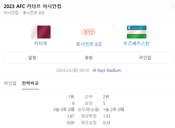 우즈베키스탄은 2024년 02월 04일 카타르를 상대로 이긴다면, 2011년 이후 처음으로 아시안컵 준결승에 진출을 할 수 있게 됩니다. 하지만 카타르 또한 이번 2023 AFC 카타르 아시안컵에서 나쁘지 않은 성적을 보여주고 있어 이번 경기 또한 예측이 되지 않습니다.