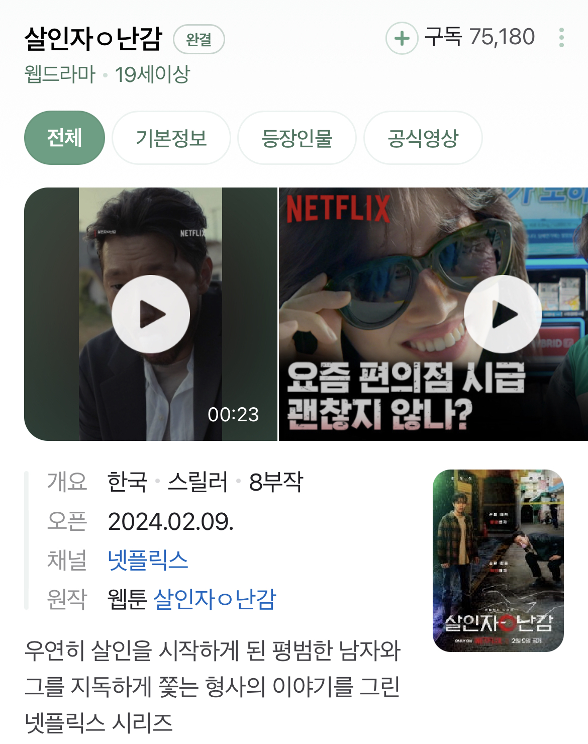 웹툰 원작은 54화인데, 드라마는 몇부작인지 궁금해하시는 분들이 많으신데요. 넷플릭스에 단독 공개된 살인자 o난감은 총 8부작으로 회당 50분으로 구성되어 있습니다.