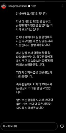 이와 같이 논란이 되자 이강인은 인스타에 사과문을 게시하였는데, 이강인 사과문에 따르면 그는 '지난 아시안컵 4강전을 앞두고 손흥민 형과 언쟁을 벌였다는 기사가 보도되었습니다.'라며 이어 그는 '제가 앞장 서서 형들의 말을 잘 따랐어야 했는데, 축구팬들에게 좋지 못한 모습을 보여드리게 되어 죄송스러울뿐입니다.' 라며 결국 그가 손흥민과 다툼을 했다는걸 인정하는 모습을 보였습니다.
