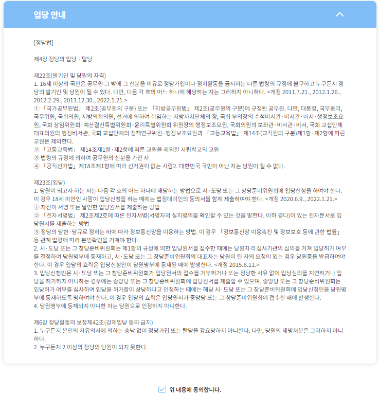 2. 입당안내를 읽어보고 '위 내용에 동의합니다'를 체크 후 입당신청을 클릭한다.