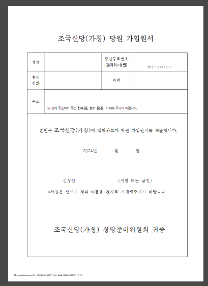 5. 조국신당(가칭) 당원 가입원서가 나오면, 성명, 주민등록번호 (앞자리+성별), 휴대폰 번호, 직업, 주소 그리고 날짜와 신청인 서명 또는 날인을 하고 서명 시작하기를 눌러준다.