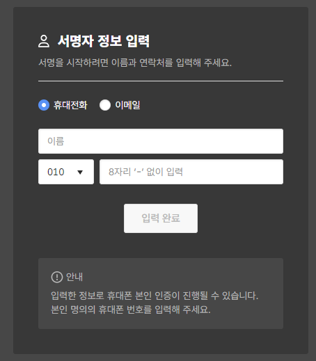 4. 서명자 정보 입력을 해주는데, 이때 이름과 휴대폰 번호를 입력해주고 나서 입력완료 버튼을 클릭한다.