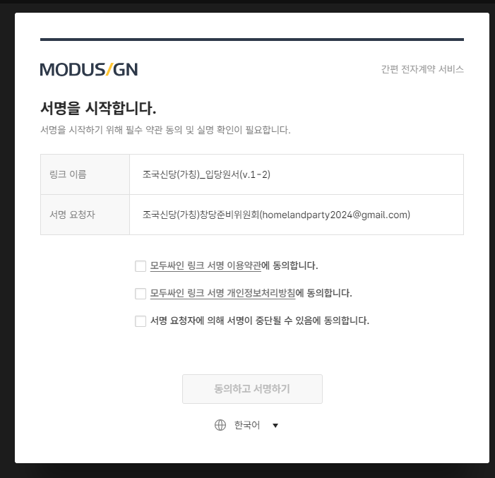 3. MODUS/GN 서명을 시작하기 위해 필수 약관 동의 및 실명 확인을 해준다. 이때 3가지 약관에 대해 동의 체크 후 동의하고 서명하기를 눌러준다.
