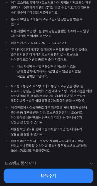 이번 토스 돈 나눠주기 이벤트는 게릴라 식으로 진행하는 것이 아닌 4일간 진행되는데요. 토스 돈 나눠주기 이벤트 기간은 2024년 2월 26일부터 2월 29일까지 진행이 됩니다.