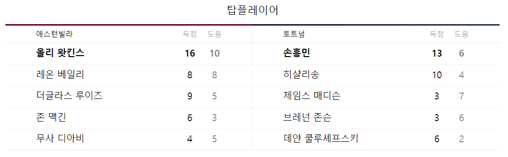 현재 득점 부문 순위 2위로 16골을 넣은 애스턴빌라의 올리 왓킨스와, 13골을 기록하며 6위를 달리는 토트넘의 손흥민이 이번 경기에서 어떤 모습을 보여줄지가 기대됩니다. 3골 차이로 손흥민의 특기 몰아치기 득점이 이번 경기에서 빛을 볼 수 있을지가 기대되며, 부디 이번 경기가 좋은 결과로 이끌어질 수 있도록 희망합니다.