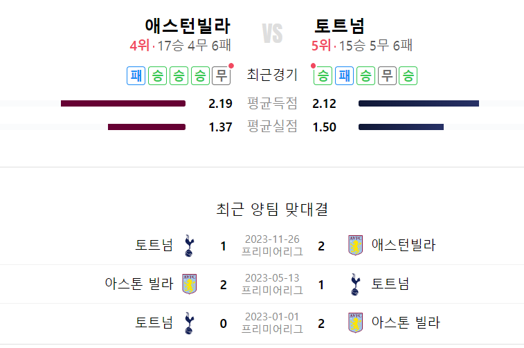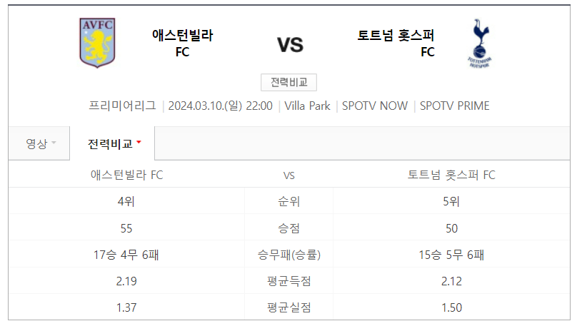 현재 두 팀의 전력비교를 보자면 애스턴빌라는 4위로 승점 55점을, 그리고 17승 4무 6패를 기록하고 있습니다. 반면 토트넘은 현 순위 5위로 승점 50점 그리고 15승 5무 6패를 기록하고 있는데요. 여기서 차이점은 토트넘이 애스턴빌라보다 1경기를 덜 치뤘다는 것입니다. 이번 경기에서 애스턴빌라를 잡게된다면 승점 2점 차이로 격차를 좁힐 수 있게됩니다. 토트넘은 이번 경기에서 이기면 첼시와의 한 경기가 더 남았는데요. 첼시와의 대결에서도 승리를 해야만 4위로 진입이 가능하게 됩니다.
