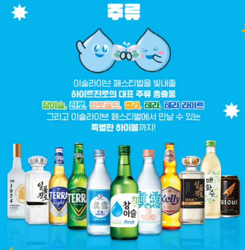 이 외에도 이슬라이브 페스티벌을 빛내줄 하이트진로의 대표 주류들이 총출동한다고 합니다. 하이트진로를 좋아하시는 분들이라면 두손두발 들고 정말 좋아하시리라 생각이 되는데요. 참이슬, 진로, 진로골드, 켈리, 테라, 테라 라이트까지 만나보실 수 있으며, 이슬라이브 페스티벌에서만 만날 수 있는 하이볼까지 준비가 된다고 하네요.