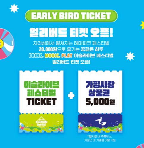 얼리버드 티켓 예매 하신분들은 가평사랑 상품권 5,000원이 지급되며, 가평사랑 상품권은 2024 이슬라이브 페스티벌 주류부스 또는 가평군내 가맹점에서 사용가능 하다고 합니다.