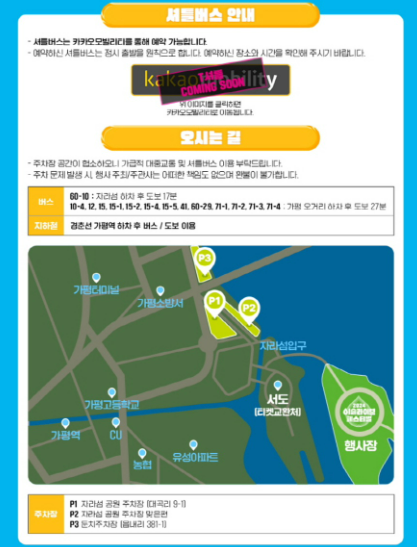 2024 이슬라이브 페스티벌에는 셔틀버스 지원도 한다고 하는데요. 셔틀버스는 카카오모빌리티를 통해서 예약이 가능하다고 합니다. 예약한 셔틀버스는 정시 출발을 원칙으로, 예약한 장소와 시간을 꼭 확인하셔야 합니다.