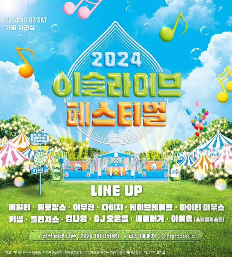 이번 2024 이슬라이브 페스티벌 공연 일정은 2024년 9월 7일 토요일에 진행된다고 하니 참고 하시기 바랍니다.