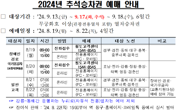| 경로, 장애인, 유공자 | 8월 26일 월요일 | 09:00 ~ 15:00 | 전화, 온라인 | 경부선, 경전선, 동해선 |