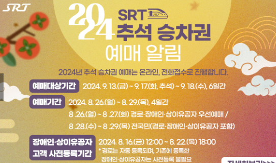2024년 추석 기차표 KTX SRT 예매를 원하시는 분들은 아래 정보를 확인하시기 바랍니다.