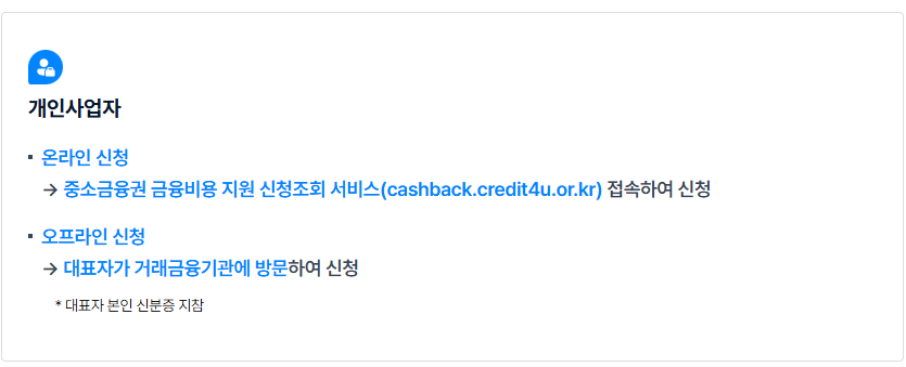 소상공인 이자환급 신청대상이시라면 신청방법을 숙지하시고서 신청하셔야 할텐데요. 신청방법은 개인사업자, 법인소기업에 따라 다르니 다음을 참고하시면 되겠습니다.