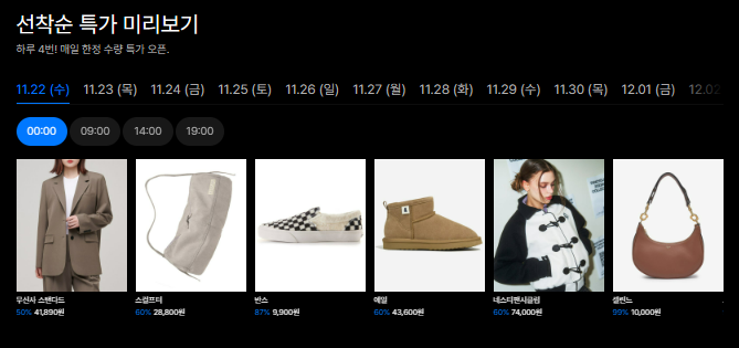 무진장 블프는 선착순 특가만이 아니라 이렇게 블프 시그니처 아이템을 선보이며 높은 할인율을 보여주는데, 이것만 봐도 '우와 살게 진짜 많다'라는 생각이 듭니다. 다양한 상품들로 남녀노소 가장 인기있는 상품들을 최대 할인율로 세일하고 있으니 꼭 겟해야겠죠?