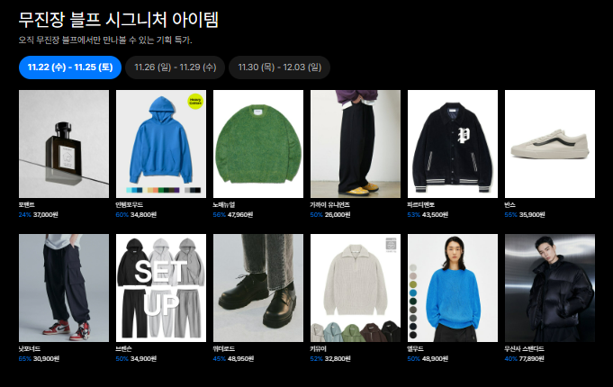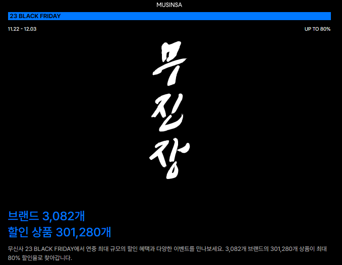 무신사 블랙프라이데이 할인은 '무진장'이라는 이름을 써서 엄청나게 큰 할인을 해준다는 그런 의미를 내포하고 있는데, 11월 22일부터 12월 3일까지 무진장 할인 이벤트가 진행됩니다.