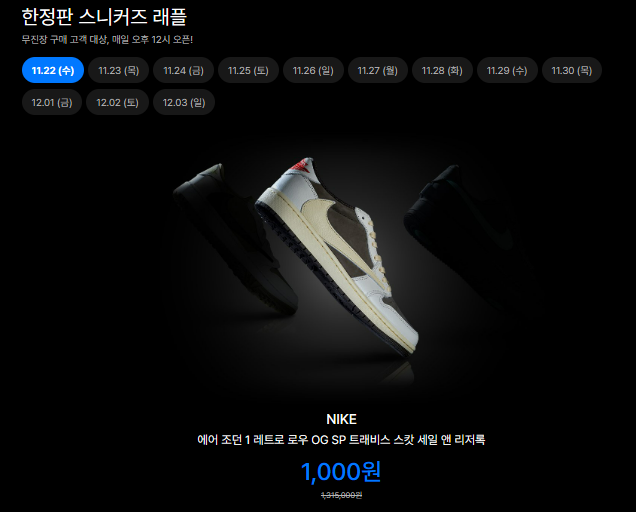 무신사는 소비자들에게 다양한 혜택을 제공하는데, 블랙프라이데이때만 진행하는 한정판 스니커즈 래플도 있습니다. 현재 트래비스 스캇 등 나이키 조던 신발들이 잔뜩 나왔는데, 이건 정말 못 참지~
