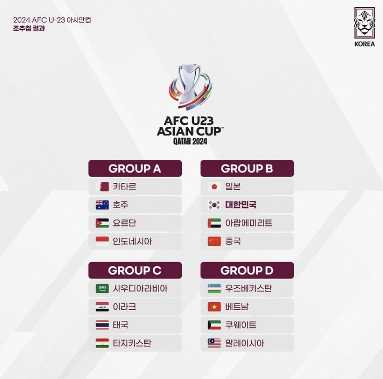 카타르 도하의 윈덤 도하 호텔에서 2024 AFC U-23 아시안컵 조 추첨식을 개최하였습니다. 2번 포트에 속해 있던 한국은 이번 추첨 결과에서 일본, UAE 그리고 중국과 함께 B조에 배정되었다는 소식입니다.