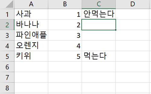 IF 함수는 사실 연계되는 함수가 아주 많습니다. 지정한 조건에 따라서 값을 변환하는데, 사실 IF 하나만 놓고 설명하기 보다는 여러 함수를 예시로 들어야 나중에 IF라는 함수가 무궁무진하다는 것을 아실겁니다. 예시처럼 조건부를 설정하는데 B1의 값이 3보다 크면 먹는다, 작으면 안먹는다 라고 설정하였습니다. 결과는 사과가 3보다 작기에 안먹는다가 나오고 키위는 3보다 많기때문에 먹는다로 변환되어서 나타내집니다.