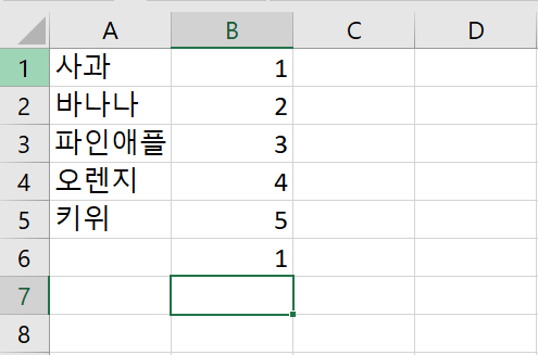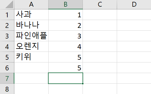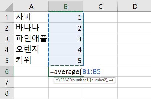 SUM이란 합계를 뜻합니다. 정해진 범위 값 내에 있는 숫자들의 합계를 나타내주는데요. 가령 예시처럼 여러 과일들의 총 합을 보기 위해서 B6에 '=sum(' 를 먼저 입력하고 마우스로 B1부터 B5까지 드래그를 하고 엔터를 눌러주면 합계가 나옵니다.