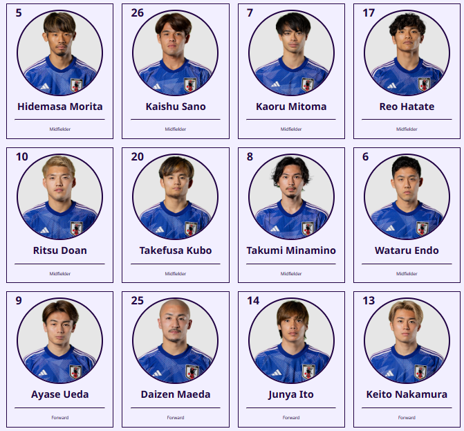 선수 : 마에카와 다이야, 스즈키 자이온, 노자와 타이시 브랜던, 다니구치 쇼고, 이타쿠라 고, 와타나베 쓰요시, 나카야마 유타, 마치다 고키, 마이쿠마 세이야, 도미야스 다케히로, 이토 히로키, 스기와라 유키나리, 엔도 와타루, 이토 준야, 나카무라 게이토, 아사노 다쿠마, 미나미노 다쿠미, 모리타 히데마사, 미토마 가오루, 마에다 다이젠, 하타테 레오, 도안 리쓰, 우에다 아야세, 사노 가이슈, 구보 다케후사, 호소야 마오