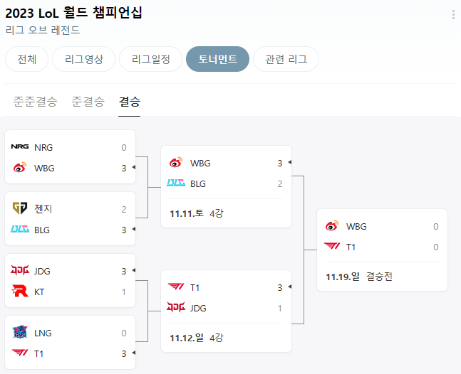 T1과 WBG의 결승 일정은 11월 19일 일요일 17시에 진행 예정이라고 합니다. 사실 롤이라고 하면 페이커가 먼저 떠오를정도로 파급력이 있는 선수다보니 많은 사람들이 T1의 플레이를 보려고 하지 않을까 싶습니다.