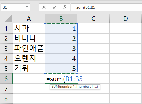 SUM이란 합계를 뜻합니다. 정해진 범위 값 내에 있는 숫자들의 합계를 나타내주는데요. 가령 예시처럼 여러 과일들의 총 합을 보기 위해서 B6에 '=sum(' 를 먼저 입력하고 마우스로 B1부터 B5까지 드래그를 하고 엔터를 눌러주면 합계가 나옵니다.