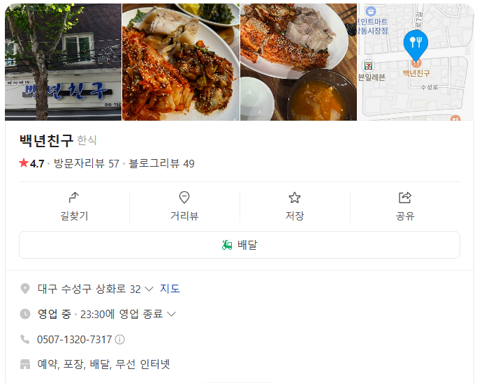 은둔식달 대구에서 달인이 운영하는 보쌈 식당은 바로 백년친구 라고합니다. 식당 위치는 대구 수성구 상화로 32에 위치해있으며, 17:00시에 영업을 시작한다고 합니다. 당연 예약, 포장, 배달이 가능한 식당이죠.